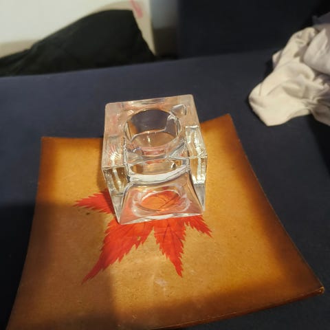 Vihreä lasinen kynttilänjalka, jossa on koristeellinen ja monimutkainen muotoilu. Sopii käytettäväksi kynttilöiden tukena sisustuselementtinä.