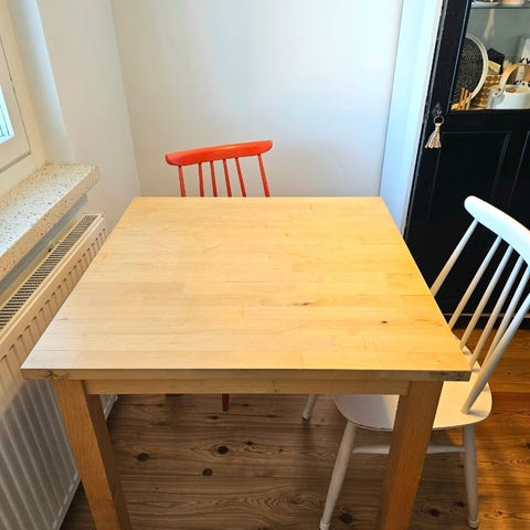 Annetaan Ikean olohuoneen pöytä. Käytön jälkiä näkyvissä.