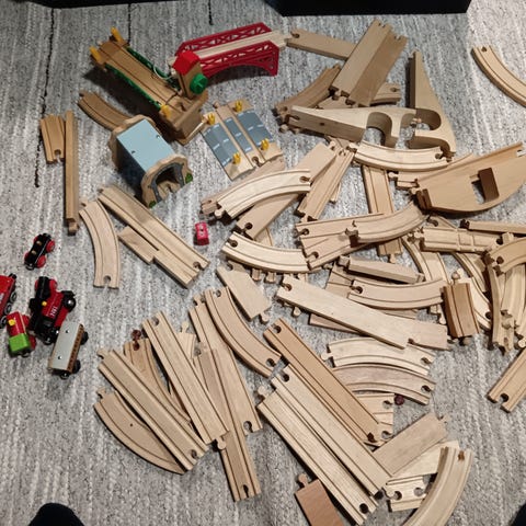Puinen junasetti. Sisältää raiteita, siltoja, junia ja muita tilpehöörejä.