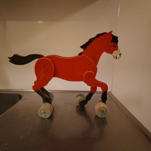 Puinen keinuhevonen, ruskea väri, mustat suitset ja harja. Keinuhevonen on valmistettu käsityönä puusta ja siinä on vaaleanvihreät keinuosat. Soveltuu lasten leikkeihin ja sisustuselementiksi.