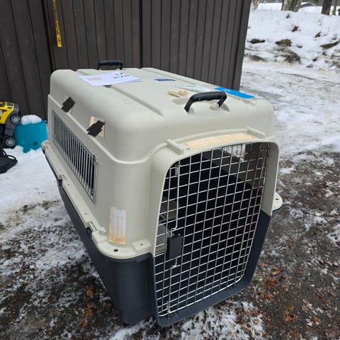 Kerran lennetty koiran IATA hyväksytty kuljetuslaatikko vesikulholla. Mitat 90 x 60 x 68 cm, max 38kg painoisille koirille