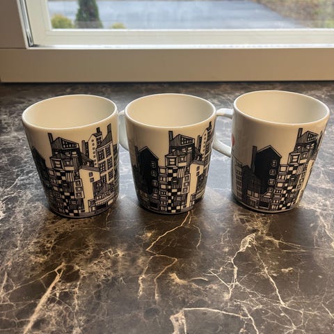 2kpl Marimekko Siirtolapuutarha mukit, Oiva 10-vuotta juhlamuki. 2kpl 35€