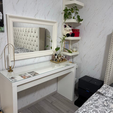 Siisti käytetty kunto. 2 laatikkoa. Peilin kiinnityksestä puuttuu yksi ruuvi ( puuttui jo kun ostettiin uutena Jyskistä) ... peili kiinni 3 ruuvilla ja hyvin on pysynyt. Pöydän korkeus 76,5 cm. Tuolin saa kaupan päälle jos haluaa. Nouto Espoon Kauklahdesta. Maksu mobilepay.