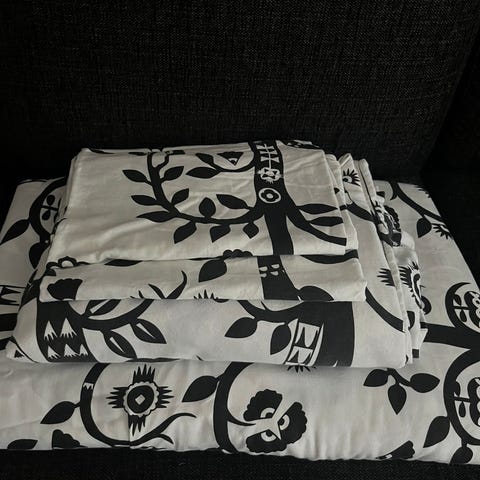 Yhden henkilön setti, jossa pussilakana sekä tyynyliina mukana. Käyttämätön uusi setti, sopii vaikkapa lahjaksi. Kulkeentuu huomenna 22.12. Maanantaina Lahti-Helsinki-Jyväskylä välille oman aikataulun mukaan. Sopii joululahjaksi. Merkki Iittala.