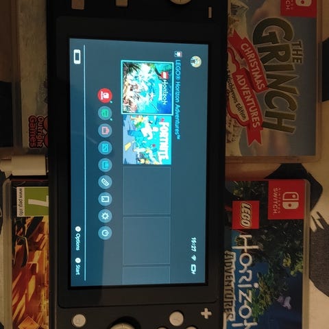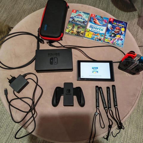 Myydään Nintendo switch -konsoli ja kuvassa näkyvät lisäosat ja peli.