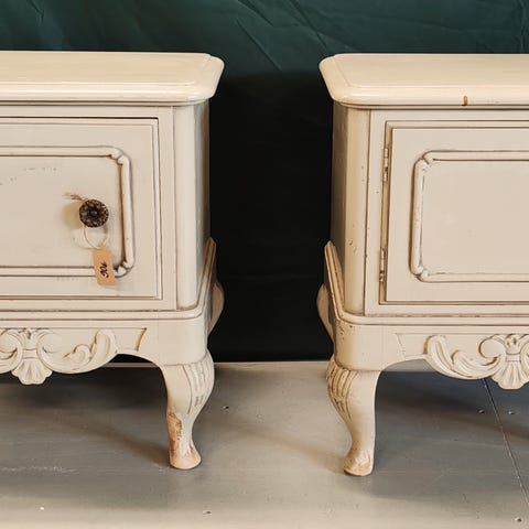Kaksi talonpoikaisrokokoo-tyylisiä yöpöytiä, joissa on koristeelliset jalat ja yksityiskohdat. Pöydissä on yksi laatikko ja koristeelliset vetimet.