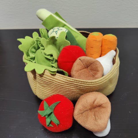 IKEA lasten leikkiruoka, pehmoleluja sisältävä kori. Kori on punainen ja sisältää erilaisia pehmeitä leikkivihanneksia ja hedelmiä lasten leikkeihin.