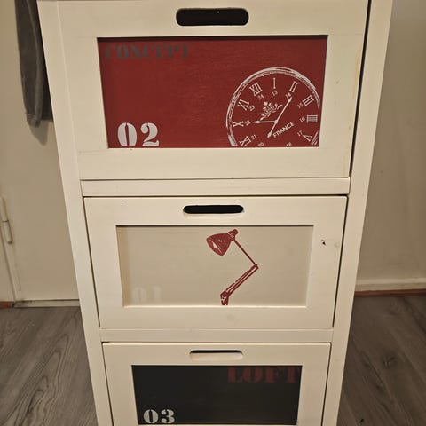 Kuvan lipasto, lasihyllyt toisessa. Kuuluvat päällekkäin, kuvassa vierekkäin. Nouto