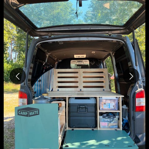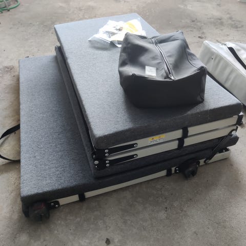 Pakettiautoon itse tehty levitettävä retkisänky esim. transporteriin mahtuu levitettynä. Sängyn alla säilytys pussi, esim. vaatteille. Koko noin 140x200cm.