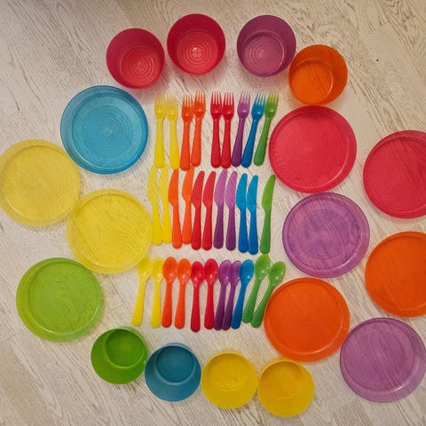 IKEA Lasten keittiövälineet sisältäen muovisia lautasia, kuppeja, lusikoita, haarukoita ja veitsiä. Värit ovat punainen, sininen, keltainen ja vihreä. Soveltuu lasten leikkeihin ja oppimiseen.