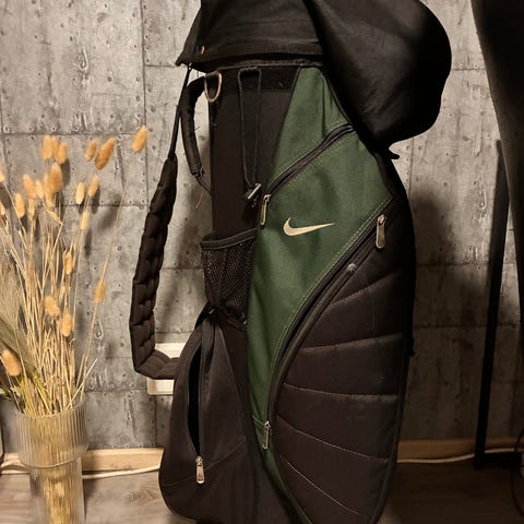Niken golfbag, harmaa/musta ja valkoinen väri. Golfbag on suunniteltu kärryihin. Siinä on useita taskuja lisävarusteiden säilytykseen. Ehjä.