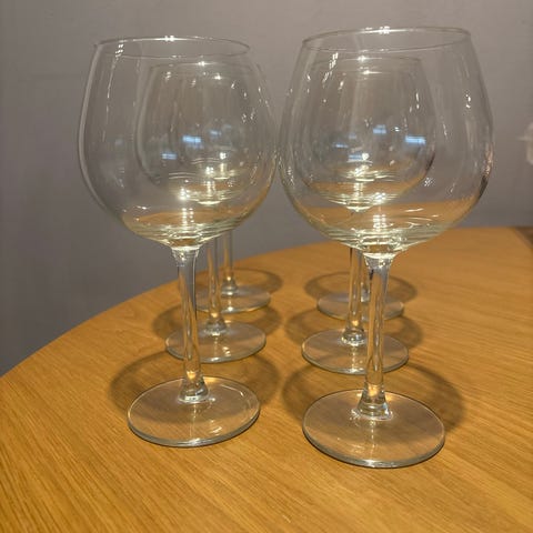 5kpl viinilaseja, ei käytön jälkiä näkyvissä. Käyttö ollut vähäistä. Alkuperästä ei tietoa.