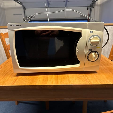 Matsui mikroaaltouuni, väriltään muu. Perinteinen mekaanisilla säätimillä varustettu mikroaaltouuni, jossa pyörivä lasialusta. Soveltuu ruoan lämmitykseen ja sulatukseen.