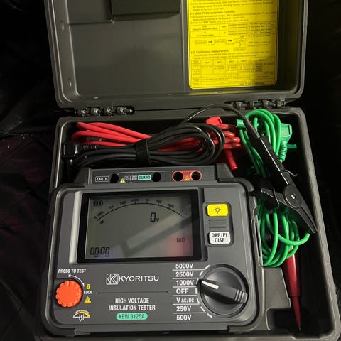 Kyoritsu KEW 8035 sähkömittari vaiheiden osoitin, jossa on kolme erillistä mittausjohtoa ja puristusliittimet. Valmistettu Japanissa.
