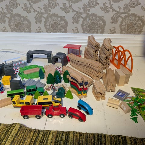 "Mummolan" leluina ollut, vähäisessä käytössä, kunto erittäin hyvä. IKEAn LILLABO junarata jota on siis kaksi peruspakettia nyt myynnissä. Lisäksi muutama ylimääräinen (ei ko. sarjaa kuuluva) puinen pala/lelu (kuvassa näkyy liikennemerkit, puu- ja talokuvioitu puupalikka, keltainen pikkuauto).