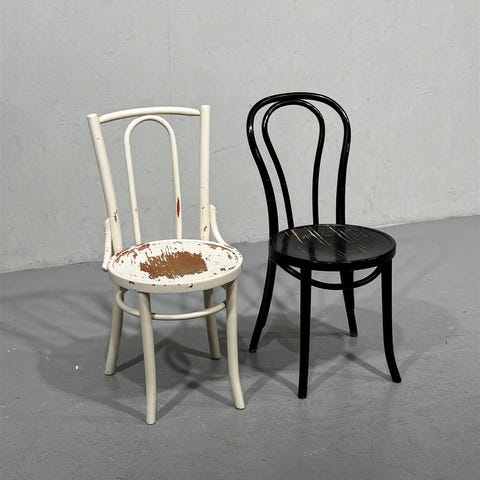Neljä thonet -tyylistä tuolia rottinki-istuimella. Kaipaavat entisöintiä.