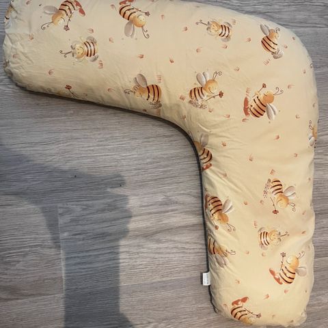 Valko-beige-raidallinen Lidlin imetystyyny. Täytteenä pienet pallomaiset rakeet joilla tyynyä saa muovattua sopivaksi imetysasentoon. Irrotettava ja pestävä päällinen.