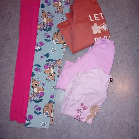 Vaatepaketti 110 cm, Peppi mekko, kaksi College puseroa, ohut pitkähihainen pusero, kolmet legginsit. Kaikki hyväkuntoisija.