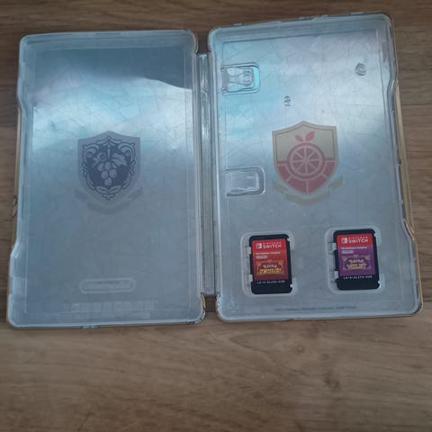 Scarlet vielä muoveissa, Violet pelattu läpi ja steelbook hyvässä kunnossa. Pokepallo koodit myöskin käyttämättömät.