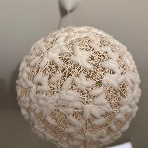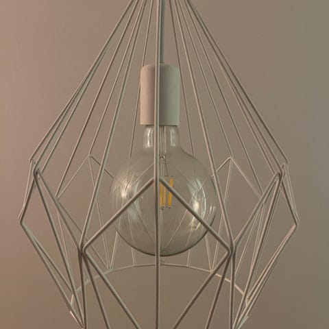 Valkoinen kattovalaisin, jossa on viisi valkoista varjostinta. Yhdessä varjostimessa pieni halkeama (ks. kuva). Muuten erittäin siistissä kunnossa.