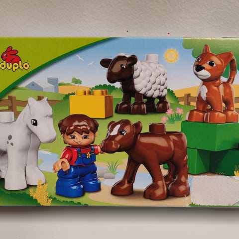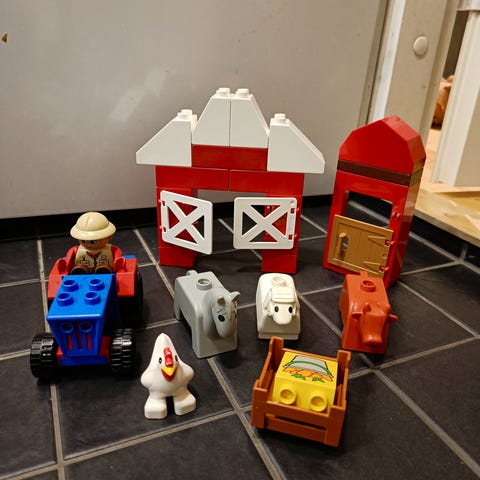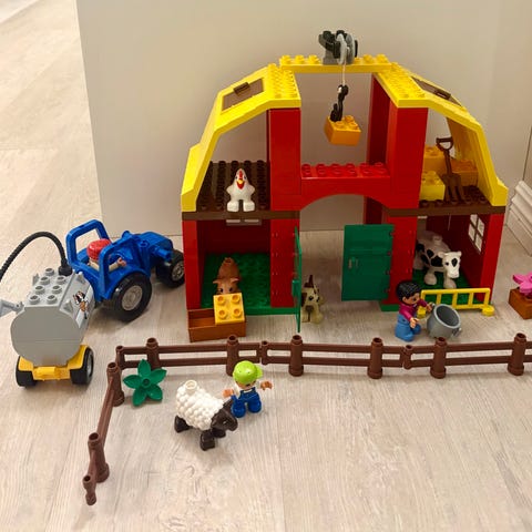 LEGO DUPLO maatilaleikkisetti, sisältää erilaisia maatilan ihmisiä, eläimiä, ajoneuvoja ja peruspalikoita.