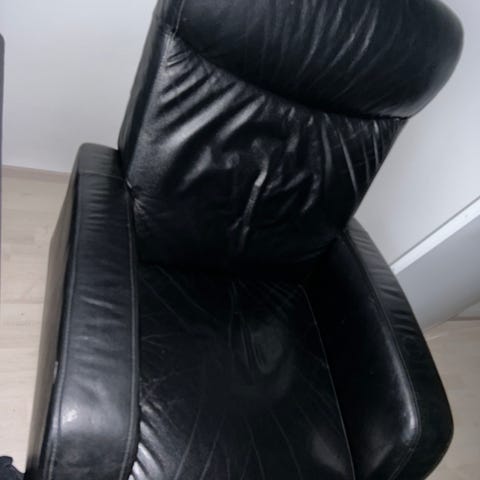 Myydään musta nahkainen nojatuoli sisään taittuvalla jalkatuella. Tuolissa on myös kääntyvä jalusta.