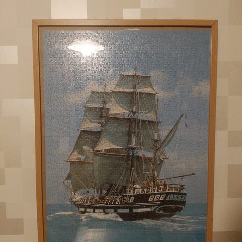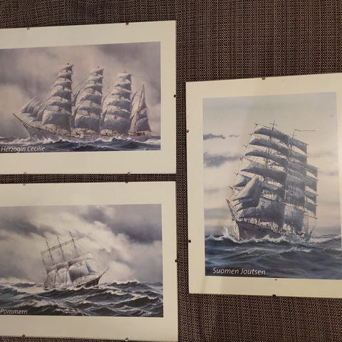 Metallinen, emaloitu taulu. Kuvaa purjelaiva. Mukana kuvassa myös laivan rakennuspuirustusta. Myös tekstiä. Kulkeutunut merimiehen mukana Suomeen kymmeniä vuosia sitten. Mitat lev. 600mm kork. 500mm ja syy. 22m