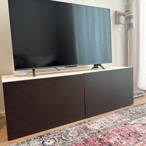 Pyökkipintainen TV-taso kahdella laatikolla.