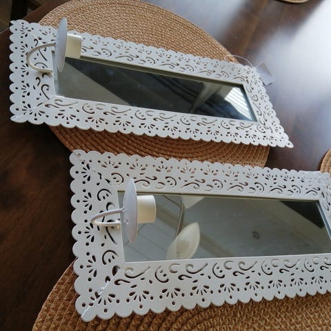 Myydään 2 faseettiin hiottua kynttilälampettia messenki jaloilla, seinään kiinnitettävät. On todella vintagea. Kukkakuvio peileissä. hinta yhteensä 35€