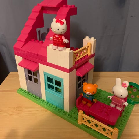 LEGO DUPLO Hello Kitty talo. Kaikki osat, noin 60 kpl tallella. Mallikuva löytyy, mutta ohjetta ei ole. Hyväkuntoinen, mutta päivänvarjon tarrat osin kuluneet.