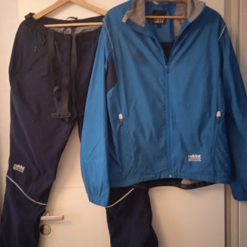 Runway unisex hiihtoasu, koko S. Takki on väriltään musta ja viininpunainen, henkselihousut mustat, lahkeiden sivussa pitkät vetoketjut. Hinta 13€.