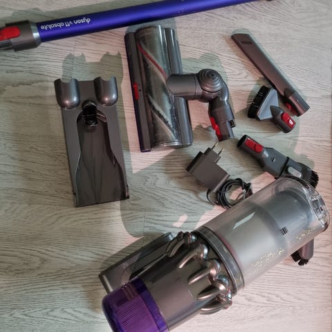 Dyson V11 langaton pölynimuri sinivioletilla värillä. imuroi hyvin ja siinä on hyvä akku, vain laturi tulee mukana