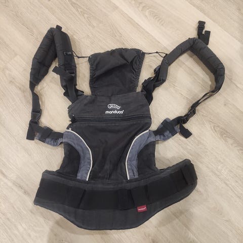 Manducan kantoreppu. Reppussa vauvaosa jolloin voi kantaa pienempää ja isompaa lasta. Unihuppu. Todella hyvä ja luotettava ollut sekä helppokäyttöinen.