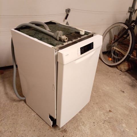 Logik astianpesukone tason alle. Laite on tarkoitettu sijoitettavaksi keittiötason alle. Valkoinen väri, sisätilat ja korit näkyvissä kuvissa.