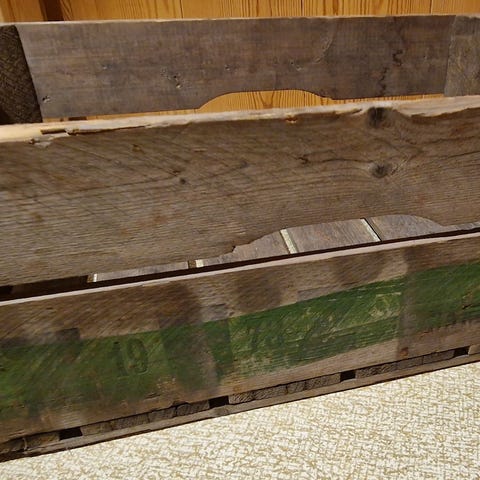 Vanha, todennäköisesti 40-luvulta oleva punottu puukori. Pituus 60 cm, korkeus n. 30 cm, leveys n. 40 cm. Nouto Länsi-Tampereelta.