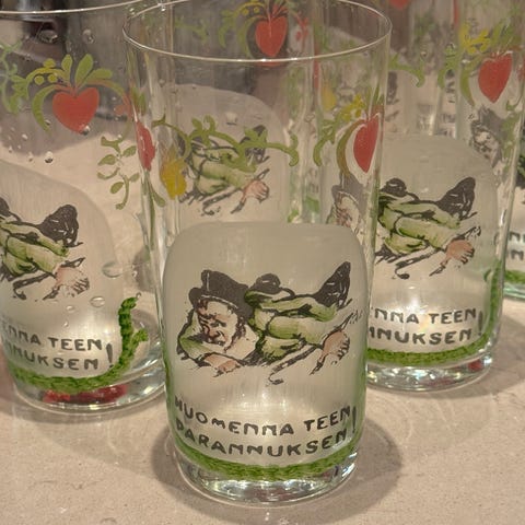 Kumela juomalaseja, 6 kpl, hyvin vanhoja, ehjiä, korkeus noin 7 cm. Halkaisija 5,5 cm. Kaapin siivous.