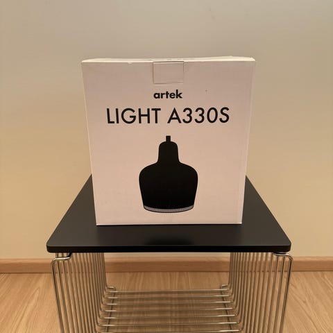 Artek A330S Golden Bell kattovalaisin, suunnittelija Alvar Aalto, väri valkoinen. Tämä upea valaisin ei harmillisesti koskaan löytänyt sopivaa paikkaa vanhasta tai uudesta asunnosta. Kerran kokeiltu kattoon ja otettu heti pois eli uusi on. Nouto Viherlaaksosta.