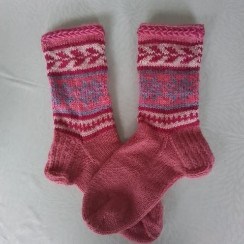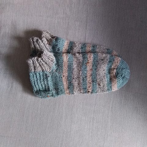 Neulottu Novita 7-veljestä langalla. Pohjan pituus 26 cm