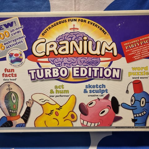 Cranium lautapeli on monipuolinen peli, joka sisältää erilaisia tehtäviä ja aktiviteetteja, valittu 2003 vuoden peliksi. Peli sopii useammalle pelaajalle ja tarjoaa viihdyttävää ajanvietettä erilaisista osa-alueista kiinnostuneille. Alkuperäinen muovailuvaha on kuivunut, muuten kunnossa.