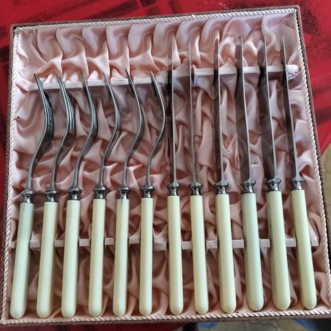 Kuvassa oleva lajitelma käytettyjä ruokailuvälineitä.