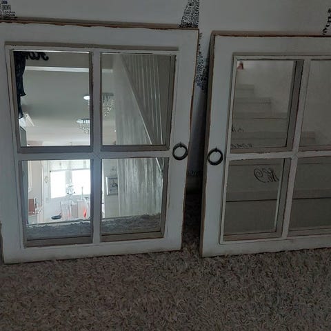 Maalaisromanttinen / antiikkistyylinen peili ovilla. Takana ripustusraudat.