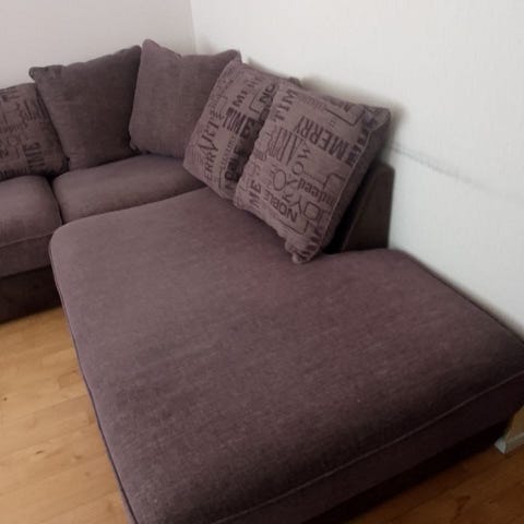Annetaan kahden istuttava tummanvihreä ryhdikäs sohva. Lemmikkikoti, joten karvoja voi tulla vähän mukana. Helppo kangas imuroida tai pestä tekstiilipesurilla.