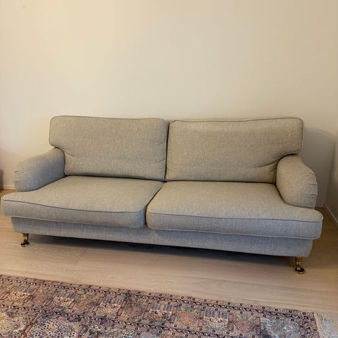 Howard-tyylinen vaalea sohva. Merkkiä en tiedä. Leveys mitattu käsinojien kohdalta, leveimmältä kohdalta. Höyhentäytteiset tyynyt. Irrotettavat päälliset tyynyissä, pesen ne ennen myyntiä. Rungossa käsinojien kohdalla käytössä tullutta jälkeä, kankaan tummentumaa, joka lähtee varmasti pois tekstiilipesuaineella. Kangas vahvaa kudosta. Käytettynä ostettu. Runko oli ostaessa rikki ja se on vahvistettu ja lisätty eteen keskelle jalka. Aikaisemman omistajan jäljiltä ruuvit edessä molemmilla sivuilla ja päädyissä. Koiratalous ja sohvaa suojattu vilteillä koko käytön ajan.