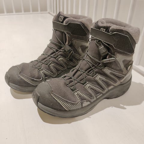 Waterproof Salomon Speedcross CSWP JR kengät, koko 39. Väri sininen ja musta keltaisin yksityiskohdin. Näitä yhdellä pojalla vähän käytetty, mutta rapaa jäänyt toiseen kenkään. Kestää hyvin vettä, hyvät Etelä-Suomen talveen.