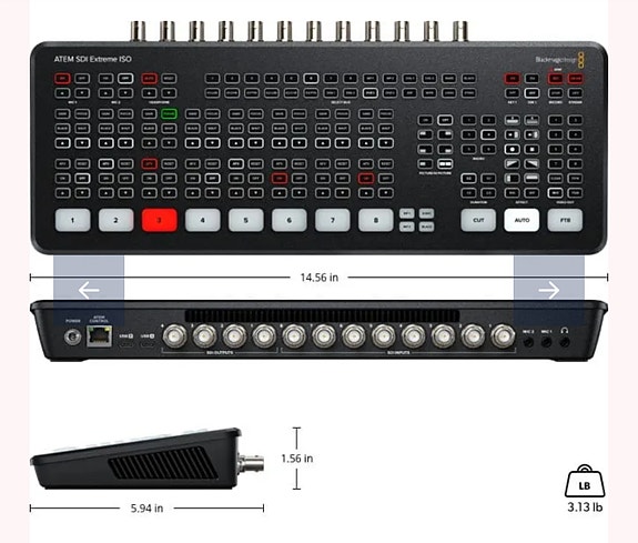 liitännät: HDMI Mini, 3,5 mm kuulokeliitäntä, 3,5 mm mikrofoniliitäntä, mini USB , 2 x XLR