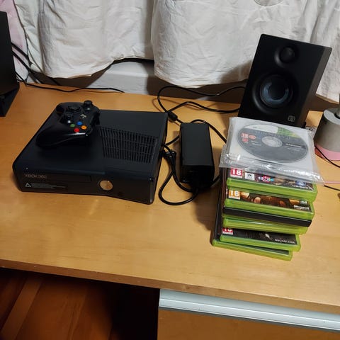 Xbox 360 Fat -konsoli, alkuperäinen ohjain, kovalevy, virtalähde ja HDMI-kaapeli.