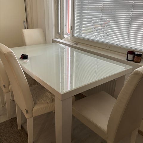 Annetaan pientä korjausta vaativa ruokailuryhmä. Molemmista päädyistä liimauksen pettäneet. Muutenkin käytönjälkiä. Kaksi jatkopalaa eli on tarvittaessa iso pöytä. Suomessa tehty Huonekalutehdas Laitalan pöytä. VAIN NOUTO!