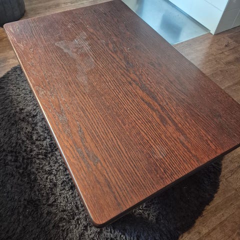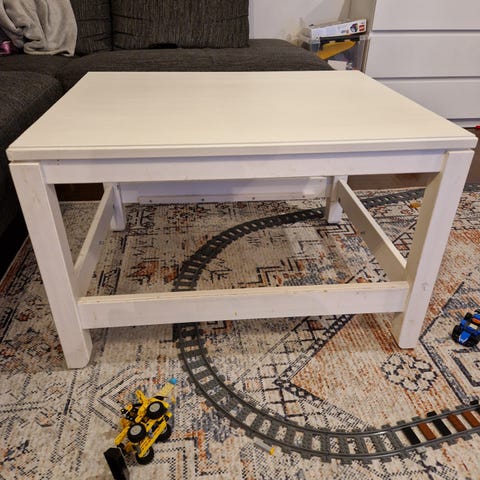 Annetaan vanha maalattu puinen sohvapöytä. Käytön jälkiä on.