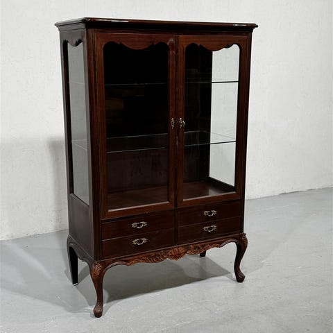 Tyylikäs rokokoo astiakaappi, jossa on lasiovet ja koristeelliset vetimet. Kaapissa on sisällä kaksi tasoa, joista toisen lasi puuttuu. Alaosassa kaksi vetolaatikkoa aterimille lokeroilla sekä kaappitilaa, jotka tarjoavat runsaasti säilytystilaa astioille ja muille esineille.