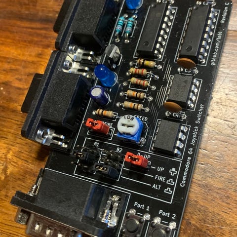 Näppärä työkalu Commodore 64 pelaajalle. Tulee molempiin joystick portteihin kiinni. Peliportin vaihto napista. Laite mahdollistaa Sega : Mega Drive ohjaimen käytön nepassa ilman ohjainmodausta - tämä ei muuten C64sen kanssa turvallista, vaikka molemmissa sama 9pin liitin. Toimii myös tavallisella C64 ohjaimella. Pohjassa suojapahvi ja tassut.